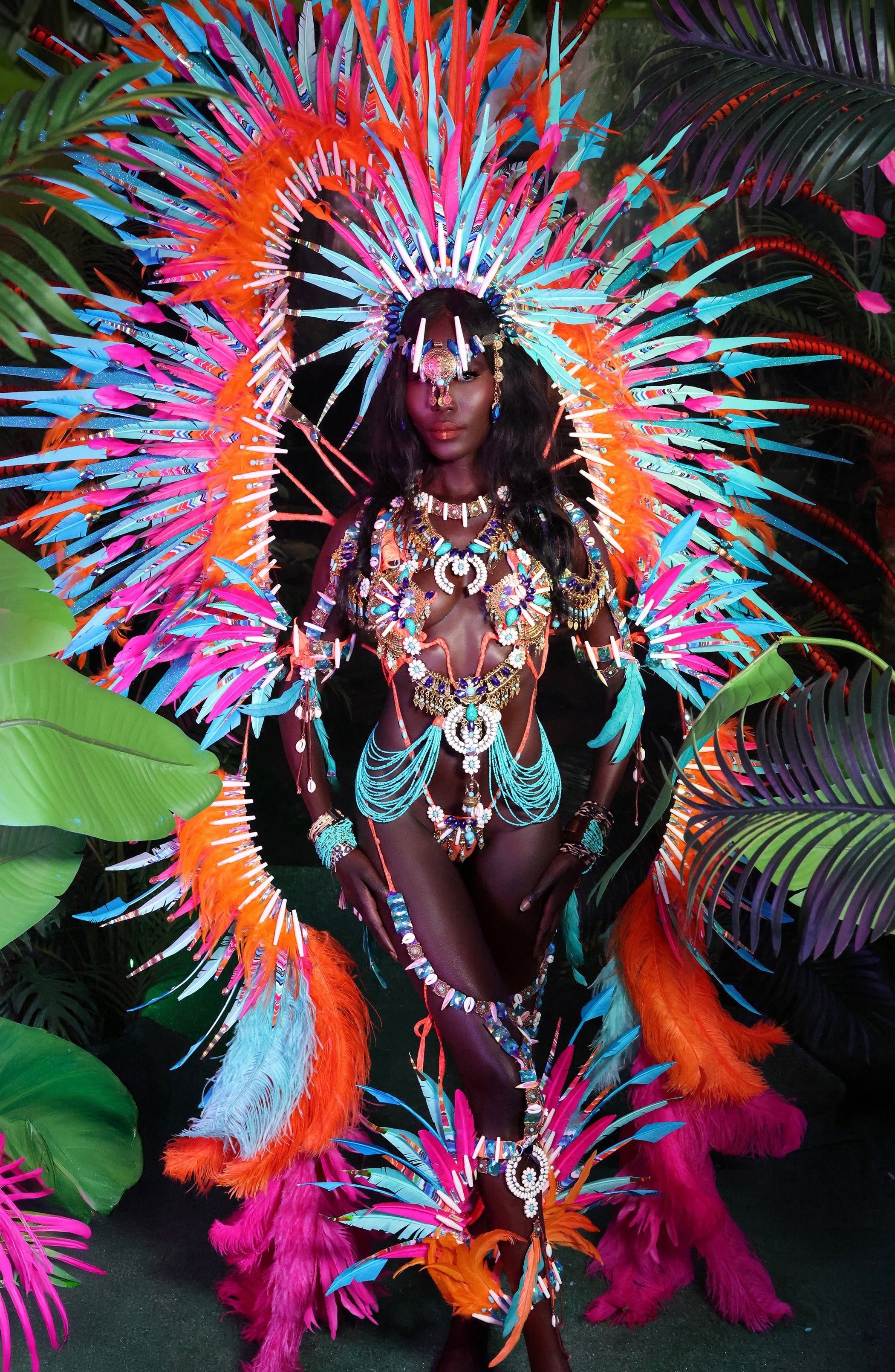 Drenched in the fiery glow of orange, kissed by the sky in turquoise, and ignited with the passion of hot pink and royal blue, this ensemble is not merely worn—it’s summoned. Glinting golden gems shimmer like treasure long guarded, while bones and shells whisper secrets of her ancestors, anchoring her story in ancient power.